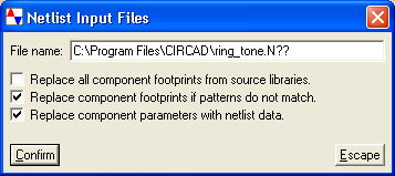 When you select this function, a dialog box will appear for the entry of the desired source netlist file name and import parameters. For multi-sheet schematics, multiple net list files can be processed in a single operation.