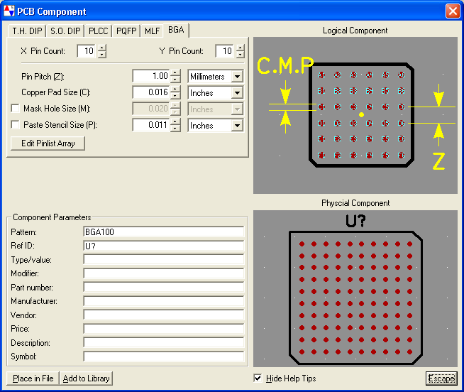The Pick Components function is used to create new components and optionally insert them into one of the existing source library files. When you select this function, a dialog box will appear which will allow you to enter the several parameters needed to properly describe the new component.