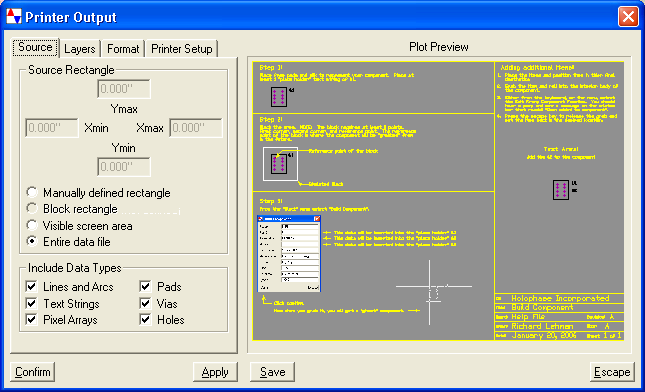 Source: The Source tab defines the area of the drawing and what data types are to be printed Source Rectangle Manually defined rectangle - Allows the user to enter values into the Xmin, Xmax, Ymin, and Ymax fields to specify the portion of the data file that is to be printed. These values are entered as X,Y position on the data file starting from absolute 0,0 point in the lower left corner of the drawing (provided that the entire drawing template has not been moved in the X,Y space). The Block Rectangle - If a rectangular block has been defined, the Xmin, Xmax, Ymin, and Ymax values will be set to the extents of the block. Visible screen area - The portion of the data file that is currently displayed on the screen will be printed. Entire data file - All elements in the data file will be printed. Include data types The assorted check boxes control wether or not a category will be printed. If an item is checked it will be printed, otherwise not. |