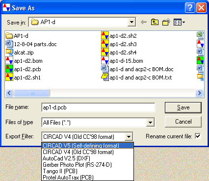 When you select this function, a dialog box will appear which will prompt you to enter the new disk file name. The current file name is shown in the entry box. Below the file name will be a list of export filters that are available for output data translation.