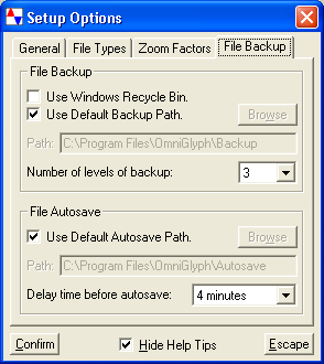 File Autosave Use Default Autosave Path - If this option is selected, OmniGlyph will use a sub-directory named "Autosave" from within the same directory that the program's EXE was invoked. If this option is un-checked, it will be necessary to use the Browse button at the right to select a autosave directory of your own choosing.