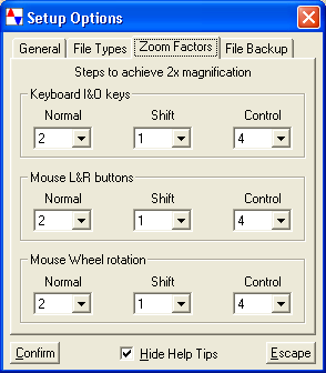 Shift - This drop-list provides a selection of possible zoom factors to be used when the <I> or <O> (shifted or upper case) keys are pressed.