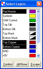 When you select this function, a dialog box will appear which will display the layer selections. You can click on a layer to add or remove it from the list of layers to be processed.